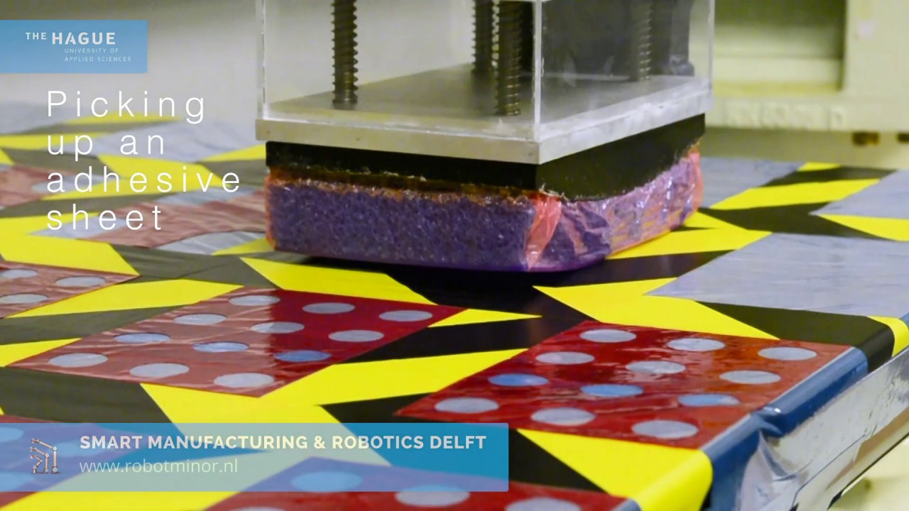 The sponge takes the shape of the 3D mold due to pressure on the EOAT, resulting in the sheet adhering to the aluminum surface. Lastly, the pressure exerted by the Kawasaki arm on the mold can be regulated in a way that it will not locally cure the adhesive sheets, which a heating element would do. This would otherwise be unfavourable, because this happens later in the autoclave process.