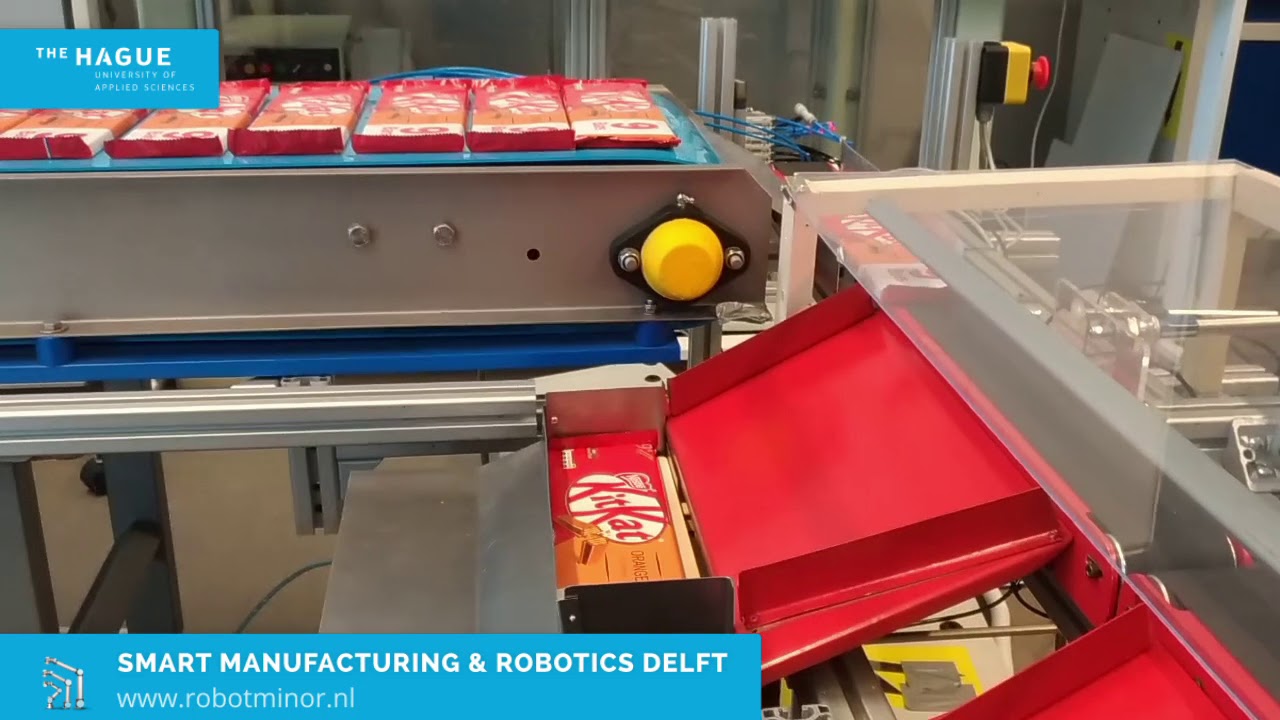 The solution consist of spreading the supply of Kitkats so that they are singled. The single Kitkats are checked with vision, the vision checks if the Kitkats face the right side and if they aren’t skewed. If they don’t face the right side or are skewed the are rejected from the conveyer belt by a pusher. After the check with the vision the good Kitkats are moved to three little conveyer belts. Here are also pushers that push 26 kitkats into two buffers. The buffer floor moves with the Kitkats down, so that de fall down in to the buffer is regulated. When the buffer is full, the other Kitkats that are moved to a second buffer that works the same as the first buffer. The buffer that is full is emptied into the box, the box is moved to the buffer by a robot. The robot then moves the full box onto another conveyer belt.